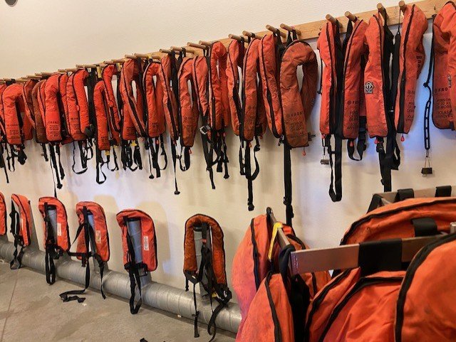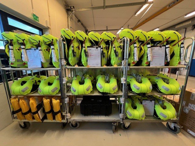 Oppblåsbare redningsvester klare for kontroll og service hos Vulken